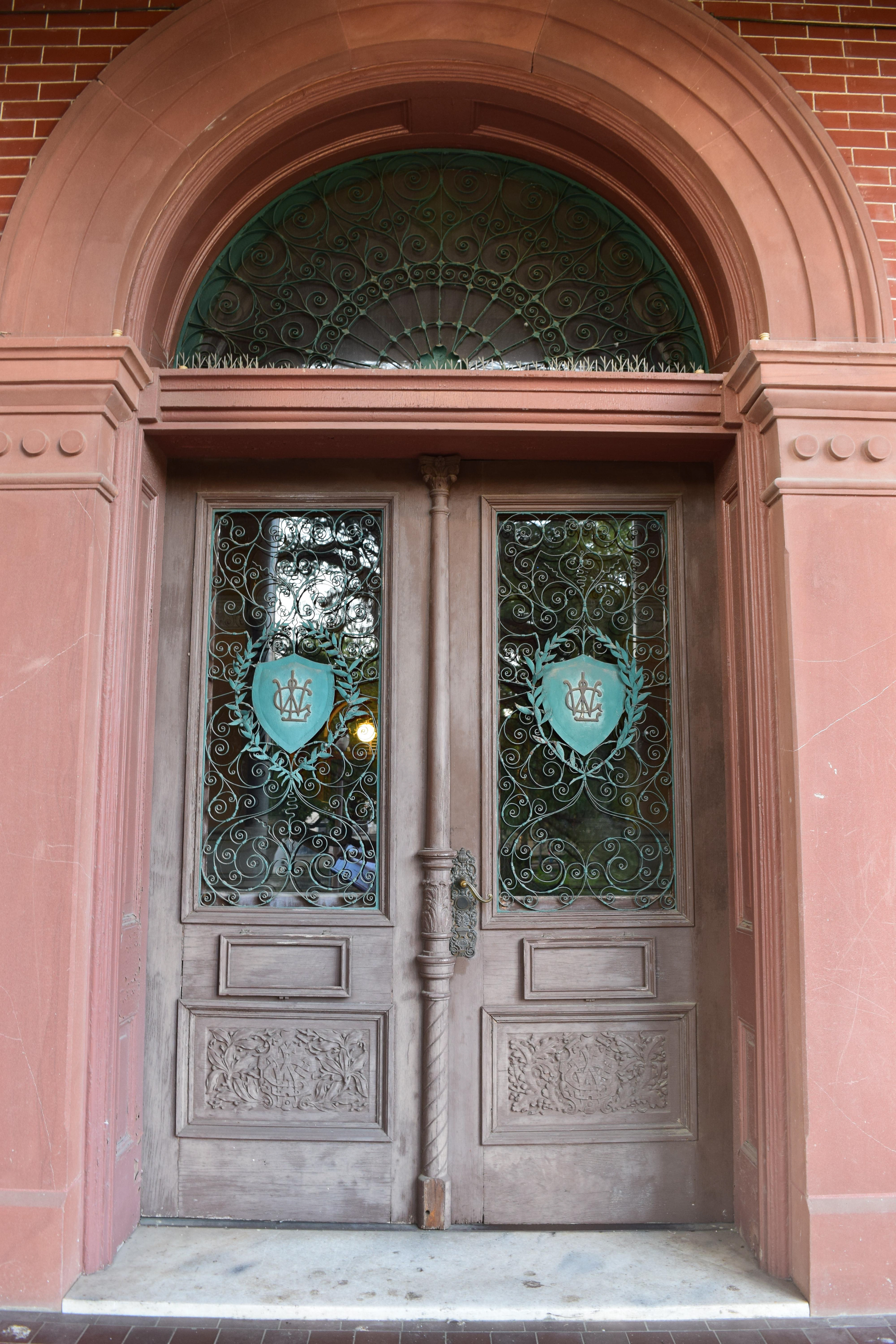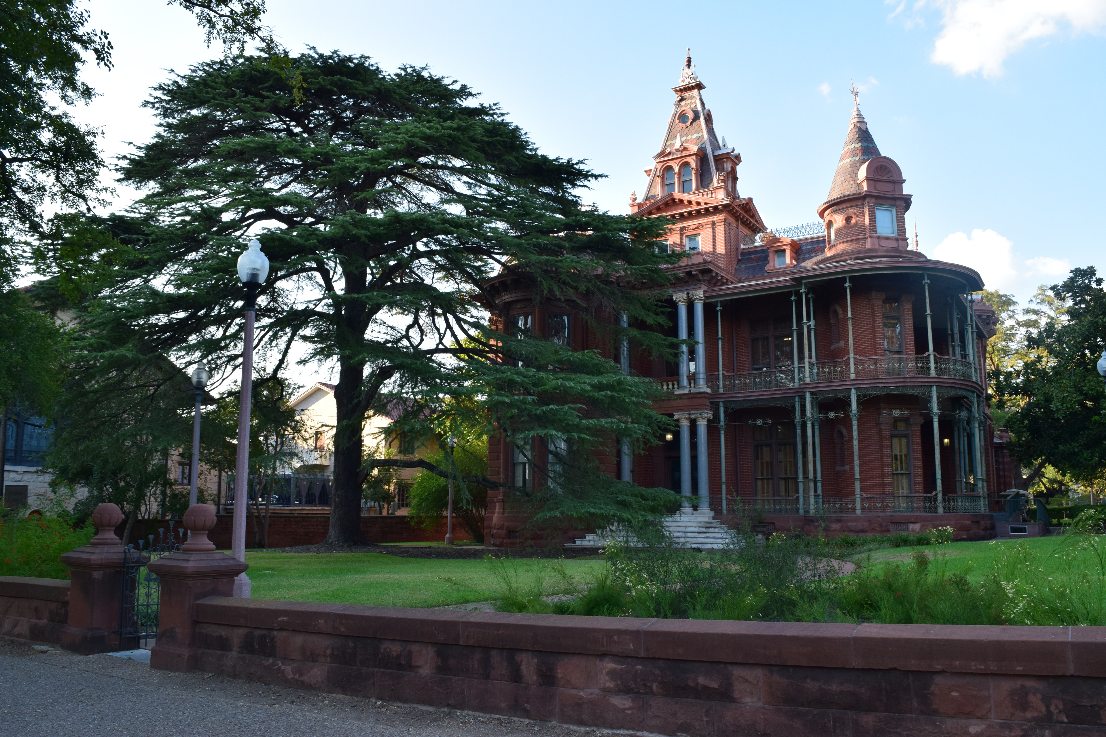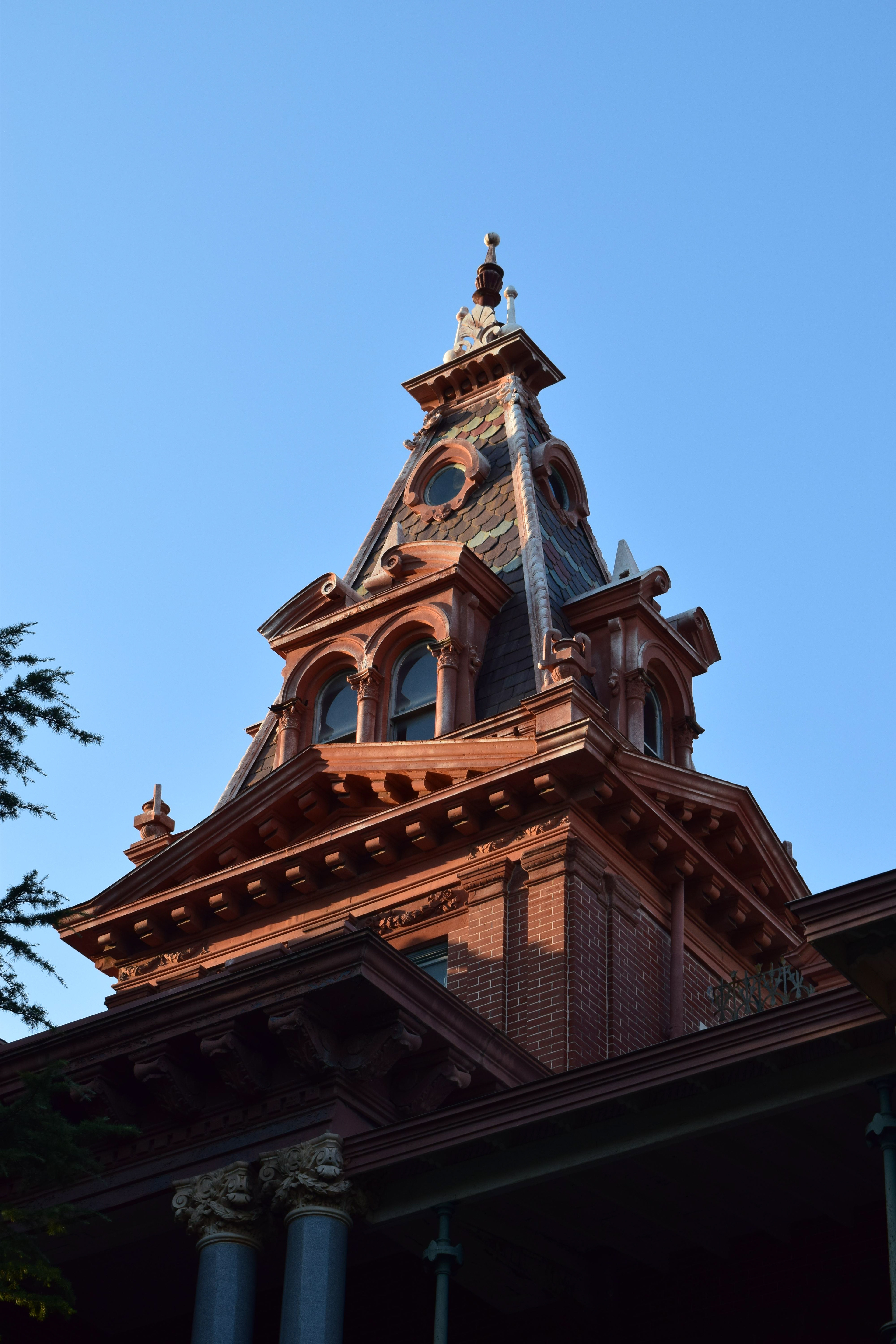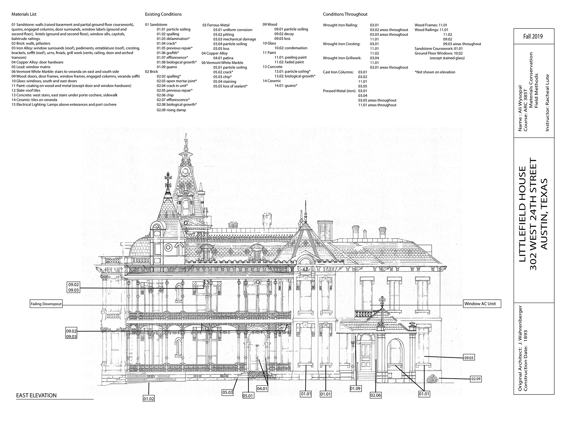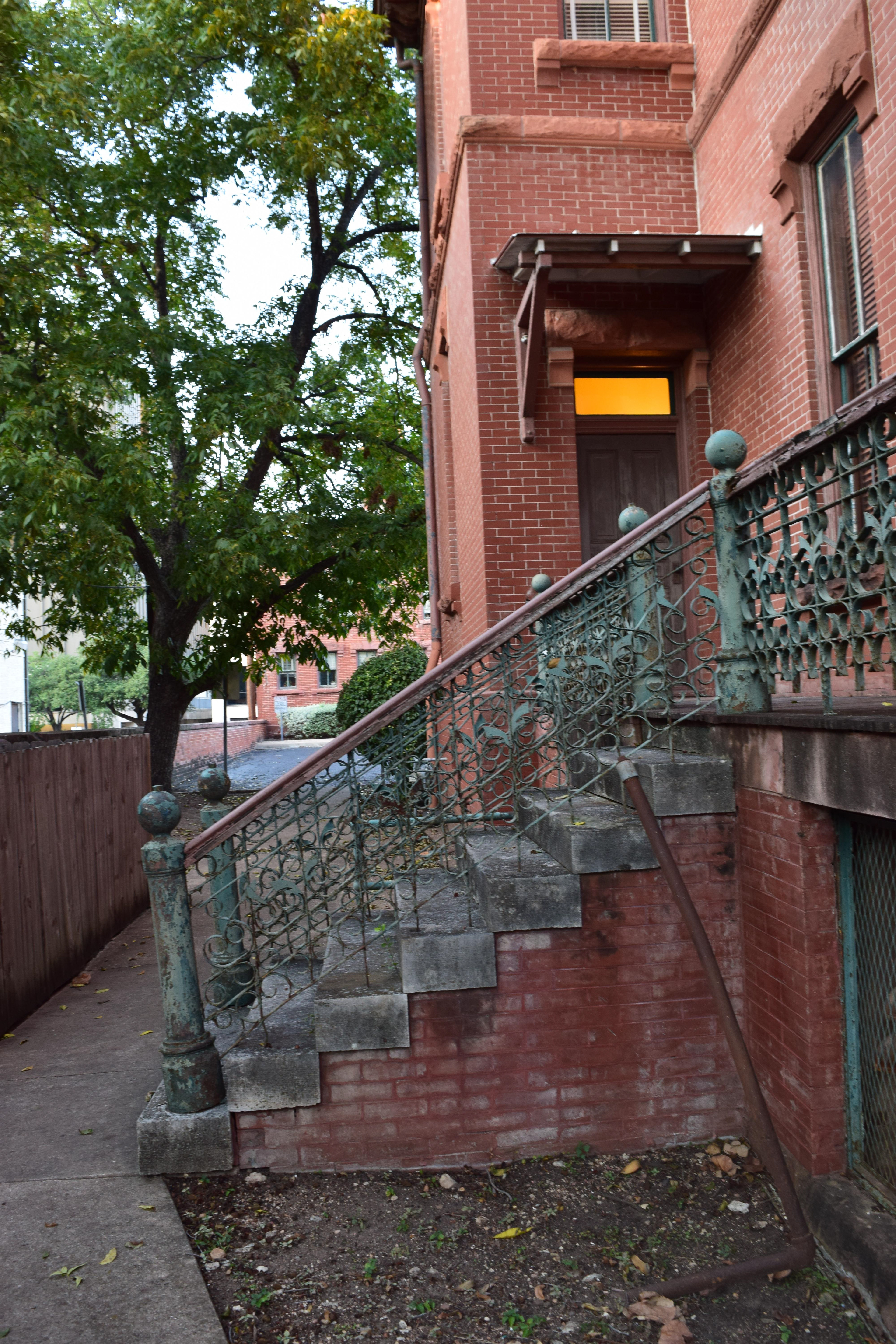 Corrosion: Evidence of iron corrosion can be seen across the wrought and cast iron work on the two story veranda and west side porch. Red stains from iron corrosion are visible, as well as pitting underneath paint (localized on the pillars) and rough patches of corrosion in areas where the paint is missing. More evidence of iron corrosion can be seen along the roof line where paint has flaked away on the brackets to reveal red iron corrosion stains and patches of corrosion. Other elements such as the urns, flashing, and pyramidal caps show signs of loss due to iron corrosion. Some green copper based patina is visible on the exterior door hardware.