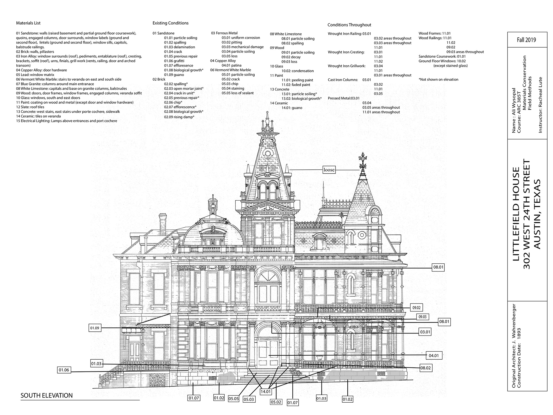 Paint Loss: There is generalized paint loss visible across the building. Primarily seen on the metal railing, vents, and wood railings that encloses the two story veranda, here the paint is actively flaking away from the metal and has become severely faded on the wood. Other wooden elements such as the doors, window frames, west porch floorboards, and carved engaged columns are also suffering from faded and flaking paint. The doors in particular have become faded and appear bleached. Portions of lintels and window frames have areas of heavy craquelure. Pressed metal elements along the sides and roof of the building also have areas of flaking paint linked with corrosion as well as portions of faded paint that now appear white as seen on the tower flashing and pediments.